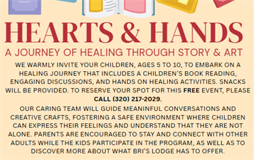 We invite children ages 5–10 to a free healing program featuring a children’s book reading, guided discussion, hands-on activities, and snacks. Our caring team creates a safe space for children to express feelings and know they are not alone. Parents are encouraged to stay, connect, and learn more about Bri’s Lodge. To reserve a spot, call (320) 217-2029.